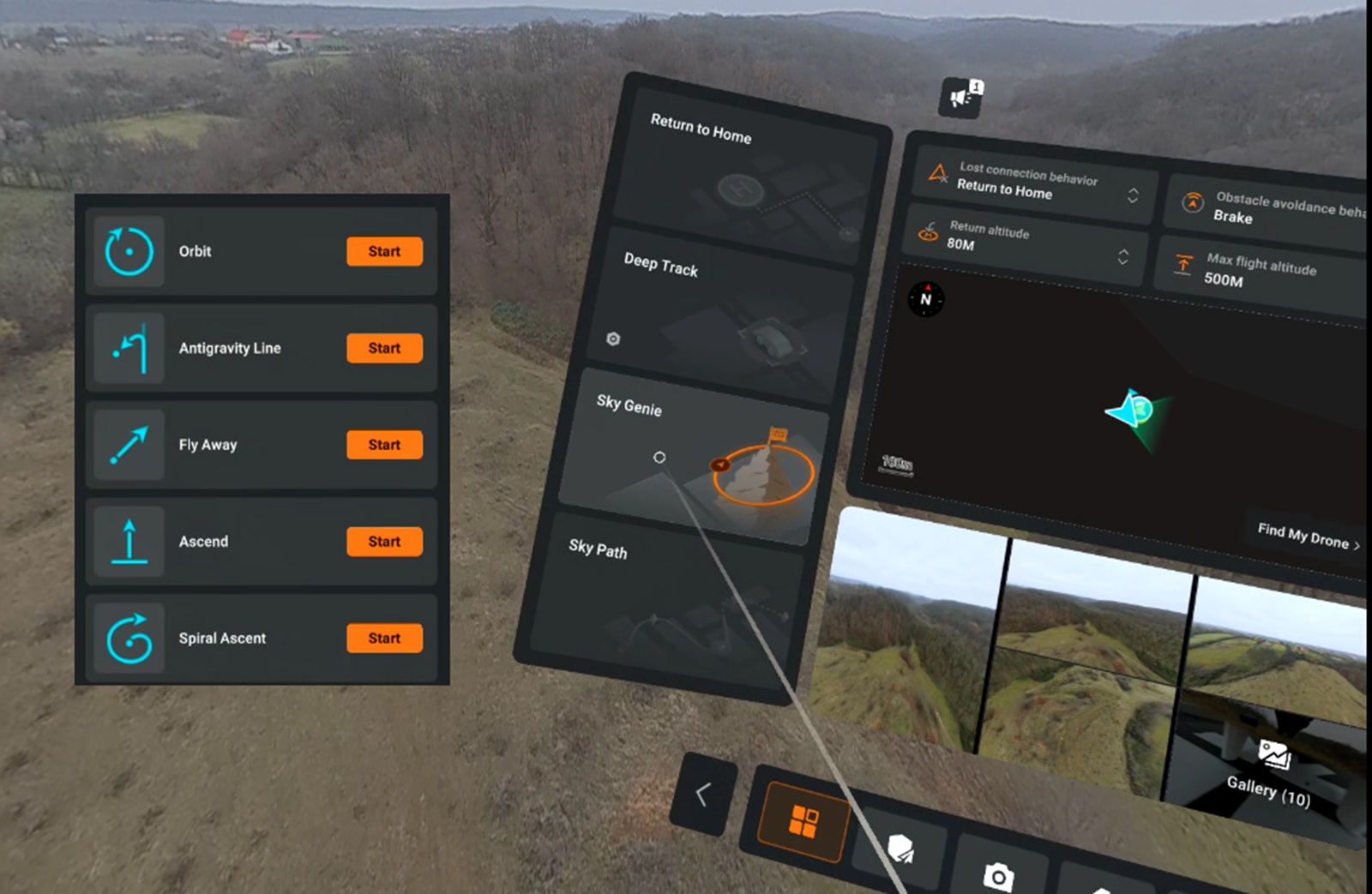 Once you dive into the system menu, it’s like opening the doors to the drone’s secret abilities. On the left panel, right under the RTH button, you’ll find a trio of autonomous flight modes: Deep Track, Sky Genie, and Sky Path. Each one feels like discovering a new superpower. Sky Genie, for example, is basically your collection of cinematic QuickShot-style moves—but with a bit more flair. It includes classics like Orbit, Fly Away, Ascend, and Spiral Ascent, along with the signature Antigravity Line.