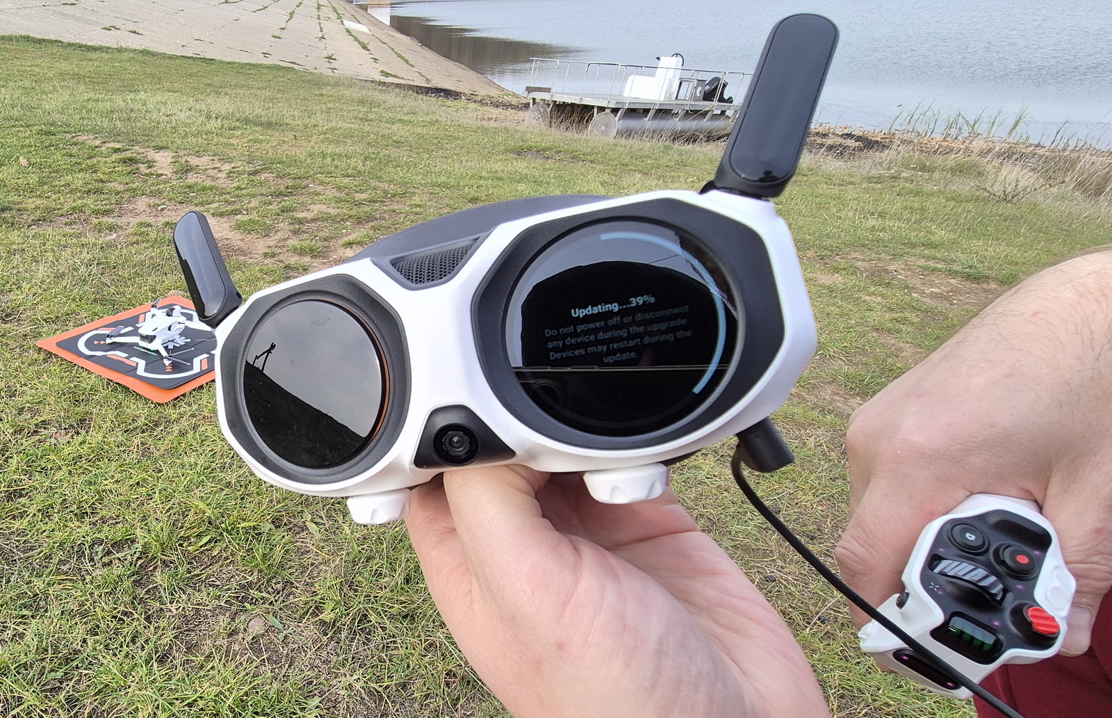 To be honest, after more than 15 years flying with Mode 2 controllers consisting of two sticks and a couple of shoulder switches, the idea of a motion grip had me a little on edge. Before my first flight with this new intuitive system, my biggest concern was simple: how on earth am I going to fly forward? So I started simple. I practiced arming, disarming, and taking off and landing without the headset, just to get a feel for the basics. Then I set myself a “precision” challenge: touch down right in the center of a 40×40 cm landing pad. After a minute of micro‑nudges and hovering like a nervous hummingbird, I realized the smarter move was… to shuffle the landing pad under the drone. Problem solved :)