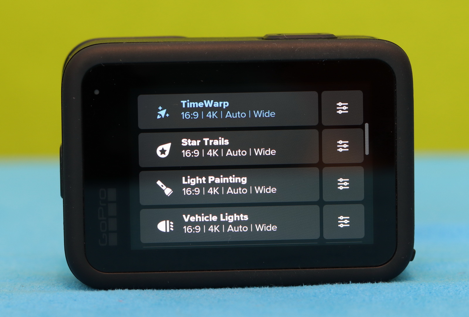 GoPro Hero 13 Black screen displaying custom video modes such as TimeWarp, Star Trails, Light Painting, and Vehicle Lights.