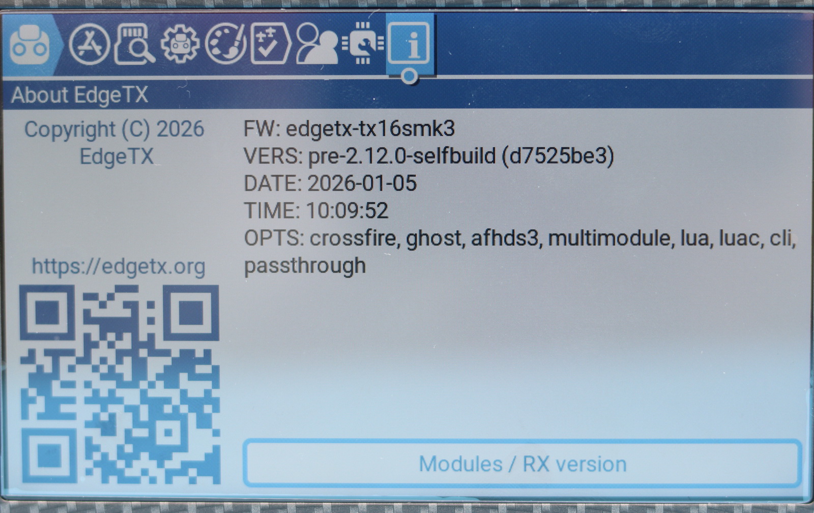 Mine arrived with EdgeTX pre-2.12.0 firmware (dated January 5, 2026), so it was fresh out of the digital womb—that unmistakable “first boot” feeling of a brand-new transmitter. Pilots who like options, the RadioMaster TX16S Mark III MAX is also fully compatible with OpenTX, giving you the freedom to choose your preferred firmware and workflow without compromise.
