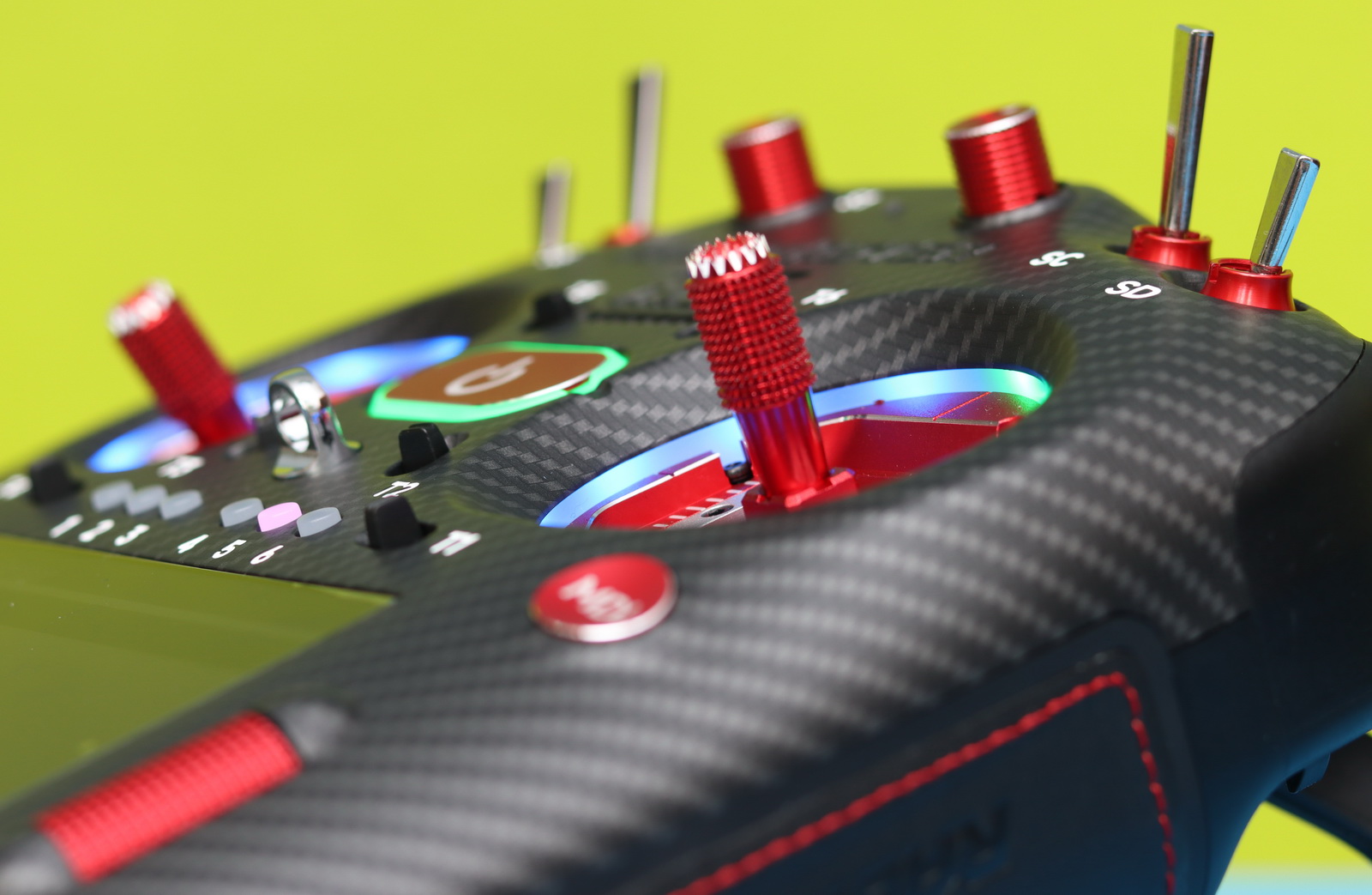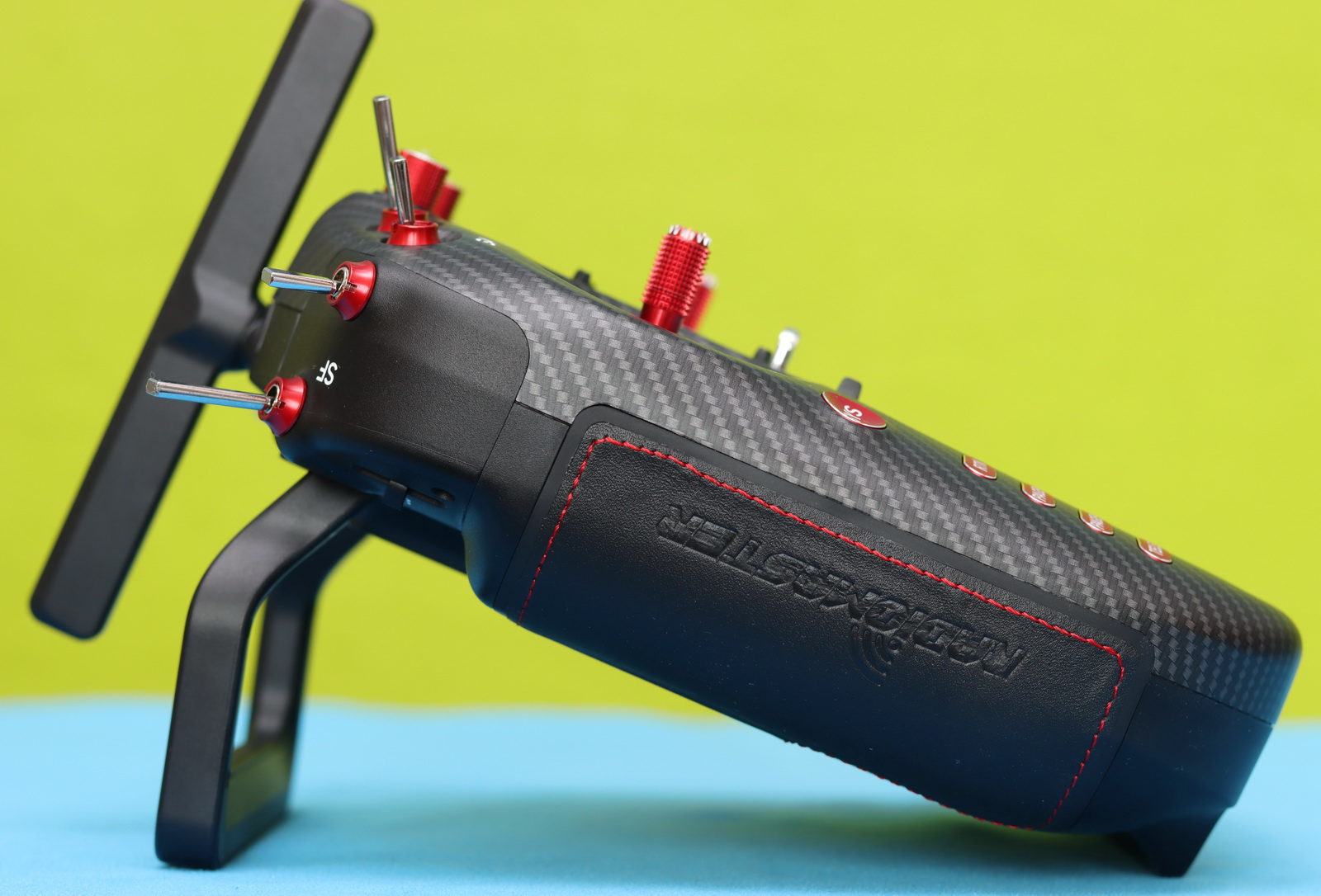 It features a carbon-fiber–style finish complemented by a leather-like insert on the grips, which immediately gives the transmitter a refined, premium look and feel. The textured materials not only enhance aesthetics but also improve grip and comfort during longer flying sessions. Subtle details, such as the decorative red stitching, further reinforce the high-end design language, adding a motorsport-inspired accent that elevates the overall visual appeal—even if the stitching itself is purely cosmetic.